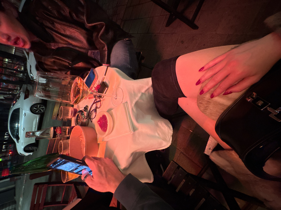 The image depicts an outdoor evening scene at a street-side establishment in Tel-Aviv, Israel, illuminated by predominant red ambient lighting. A small, round table covered with a white tablecloth occupies the central foreground. Three individuals are partially visible. On the left, a person's left hand, wearing a silver ring, holds an illuminated smartphone. In the bottom foreground, a person's legs are visible; one is clad in a dark, thigh-high boot, while the other is partially covered by a light-colored, fuzzy material. This person's right hand, featuring long, pointed red manicured nails, rests on a black handbag with a silver buckle. To the right, another individual's upper torso, dressed in a dark leather jacket and blue jeans, is visible; their face is partially obscured, showing an open mouth mid-expression. The table holds numerous items: a dark green bottle, a clear glass containing an amber liquid, a cardboard container holding fried food items, an empty clear glass, a glass Coca-Cola bottle, an ashtray containing cigarette butts, a pair of eyeglasses, a small dark rectangular object (possibly a lighter), a small white rectangular object, a large wine glass containing a light-colored wine, a small white ceramic bowl with red sauce, a neatly folded white napkin, and a blue smartphone. In the background, a city street is visible with a white sedan parked along the curb and reflections of storefront lights. Wooden chairs with slatted backs are partially visible around the table. The ground beneath the table appears to be paved.