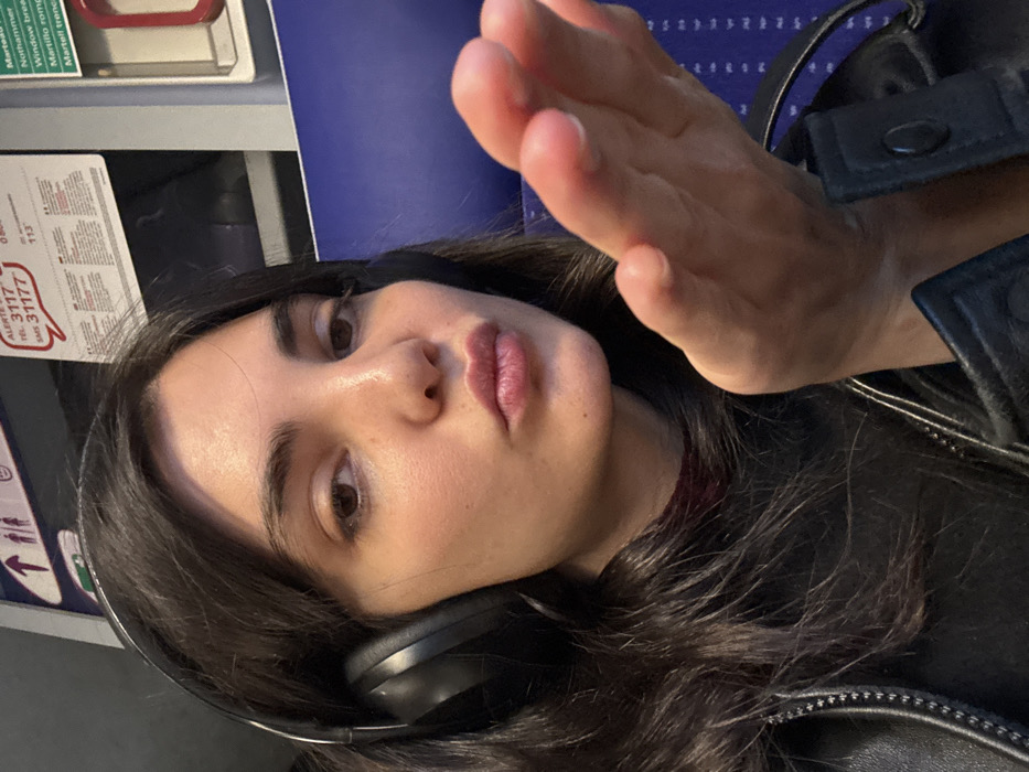 - "A woman with long, dark hair and headphones poses closely, with her hand up near the camera" by FM-kZ4ZN2, licensed under CC BY 4.0