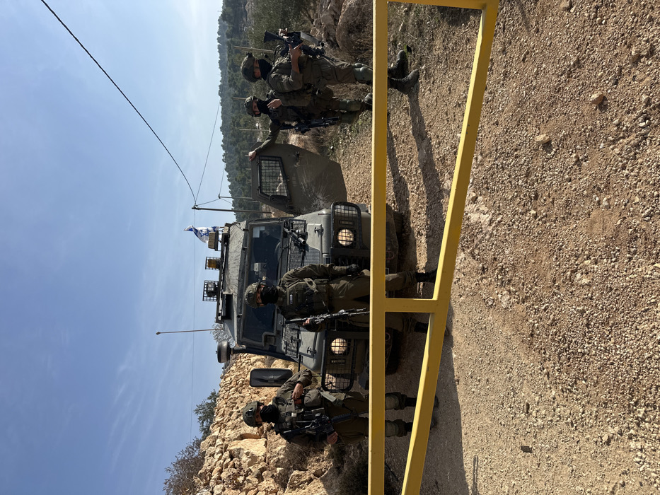 The image displays five individuals in military uniforms on an unpaved, gravel road in the city of Tarqumiyah, Palestinian Territory, under a clear blue sky. A light olive-green armored military vehicle with an Israeli flag mounted on its rear roof is central to the scene. Four individuals are visibly armed with assault rifles and equipped with tactical vests and head coverings. Two soldiers stand in the foreground, one to the left of the vehicle and one directly in front, both holding rifles. Another soldier is positioned to the vehicle's right, with an open door visible on the vehicle's side, while a fourth armed soldier stands further to the right. A fifth soldier is partially visible behind the fourth. A yellow metal barrier extends across the lower foreground. The immediate environment includes a low dry-stone wall to the left and rocky terrain with sparse vegetation and trees on distant hills in the background, with utility poles and overhead lines also visible.