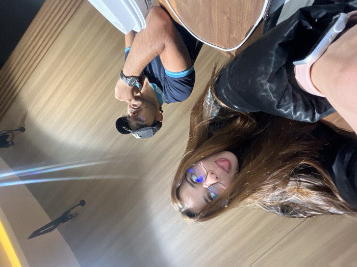 A man and a woman pose in what appears to be an interior setting with light wood-like flooring. The man, wearing a dark blue shirt and cap, has a watch on his left wrist. The woman, sporting glasses and a black top, playfully sticks her tongue out. The angle suggests the photo was taken from above, possibly a selfie. A white object is visible near the man, and a dark figure is on the wall near the woman.