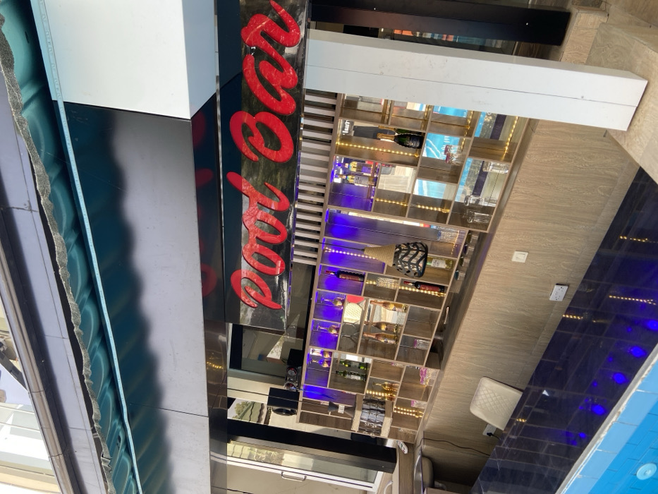 The image displays a "Pool Bar" establishment located in Barakin Lerawi, Nigeria. The scene presents a detailed view of a bar area, observed from a slightly elevated perspective. Above the bar, a dark, possibly black, awning or canopy with a teal underside is visible. Below this, a prominent sign featuring red, cursive lettering spells "Pool Bar" against a reflective, dark background. The primary subject is a well-organized bar setup. This includes a multi-tiered shelving unit, constructed from light-toned wood or laminate, filled with various bottles of alcohol such as wine, spirits, and champagne, alongside an assortment of empty and filled glassware. The shelving is illuminated by integrated blue LED strip lighting and additional warm white strip lights. A distinctive woven pendant light, conical in shape with a dark, patterned base, hangs from one of the shelves. To the far left of the bar, two black speakers are positioned on a shelf, adjacent to a small, metallic sink. In the lower portion of the image, a dark, reflective bar counter extends horizontally. Behind this counter, a single, light-colored, upholstered bar stool with a quilted diamond pattern is partially visible. The wall behind the counter and shelving unit appears to be light beige or wood-paneled, featuring two white electrical outlets. A segment of a swimming pool with blue tiles is visible in the lower left foreground, partially reflecting the blue light from the bar area. On the right side of the frame, a white vertical structural column is present. The environment appears clean and unoccupied by individuals.