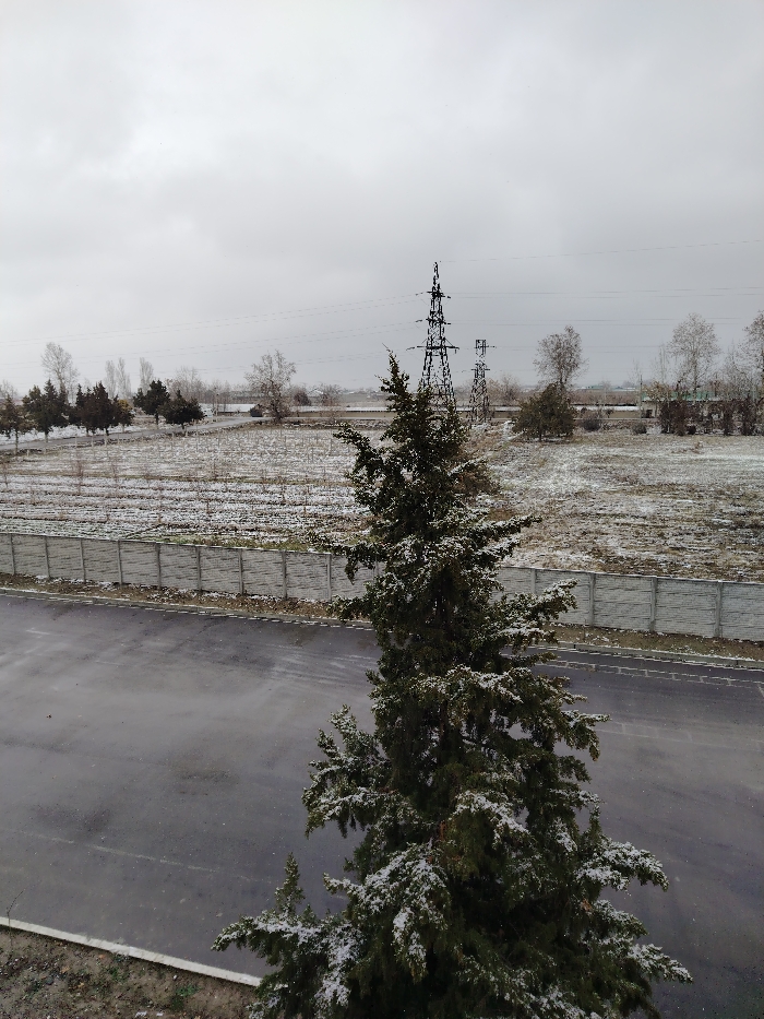 A winter scene features a tall pine tree in the foreground, lightly dusted with snow. Behind the tree is a road and a low, gray concrete fence. Beyond the fence, a field sparsely covered with snow stretches towards a horizon marked by bare trees and a lattice-like electricity pylon. The sky is overcast, contributing to the muted color palette and wintery atmosphere.
