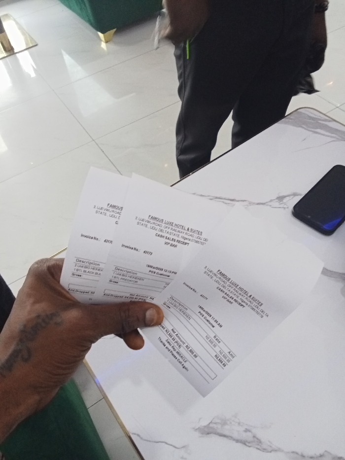 person's hand holding three receipts from Famous Luxe Hotel & Suites, located at 2, Uewuruogba off Railway Road, Lou De, Delta State, Nigeria, 07069917827