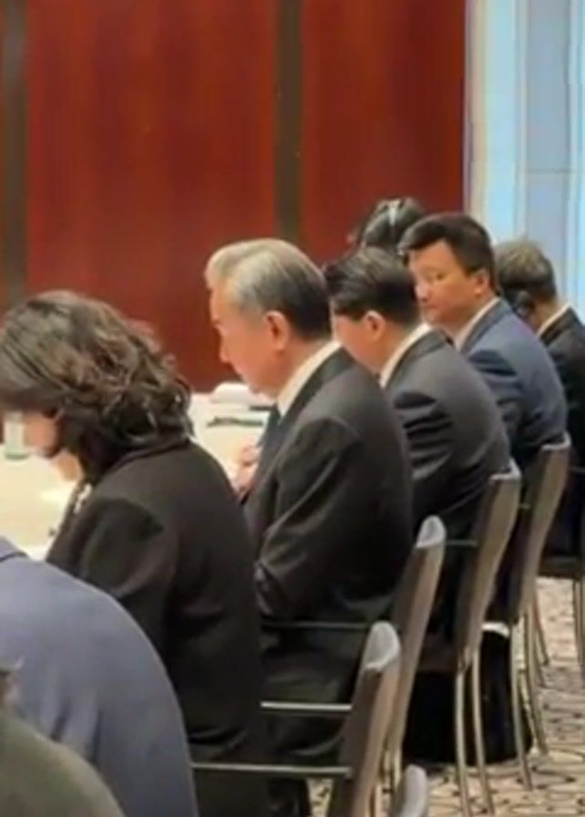 Several people sit at a long table in a well-lit room with a patterned carpet and a red wall. The people are mostly facing forward, with their backs towards the camera. They wear dark suits and appear to be at a meeting. One man, who seems to be the focus, is graying at the temples and is looking down at a paper or document in front of him. A water bottle is partially visible at the left of the frame, indicating a meeting or conference setting.
