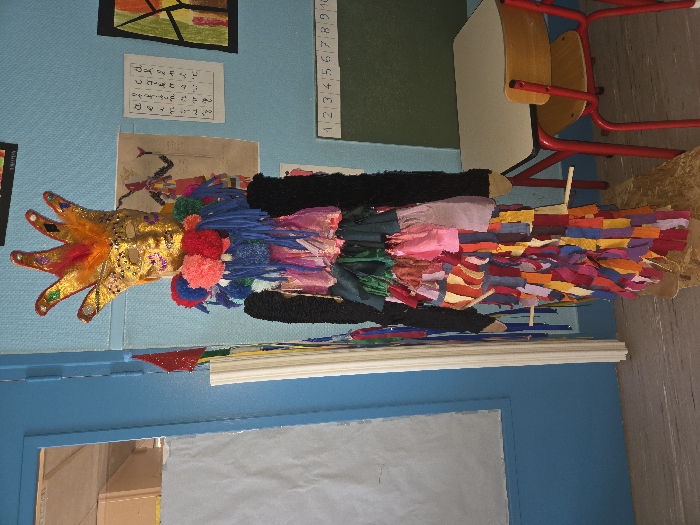 The scene captures a tall, multi-colored effigy standing in a classroom located in Caen, France. The effigy features a golden, textured mask with a pointed, jester-style crown adorned with red and black elements. Its neck is decorated with a cluster of red, blue, green, and pink pom-poms and blue fabric tassels. The body is constructed from numerous vertically hanging rectangular strips of various colored fabrics, including red, orange, yellow, blue, and pink, creating a patchwork appearance. The effigy's arms are dark, possibly black fabric. It is supported by a wooden base, with a horizontal wooden dowel extending from its lower body for stabilization. The room has light blue walls and a light brown floor. On the left, a light blue door frame encloses a window or opaque panel. To the right, a rectangular desk with a grey top and red metal legs is visible, along with a red metal chair featuring a light brown wooden seat and backrest. Wall decorations include a drawing of an abstract figure, a white paper displaying the lowercase cursive alphabet, and a framed abstract art piece with colorful geometric sections. Below these, a number line from 1 to 10 is posted above a section of a green chalkboard.
