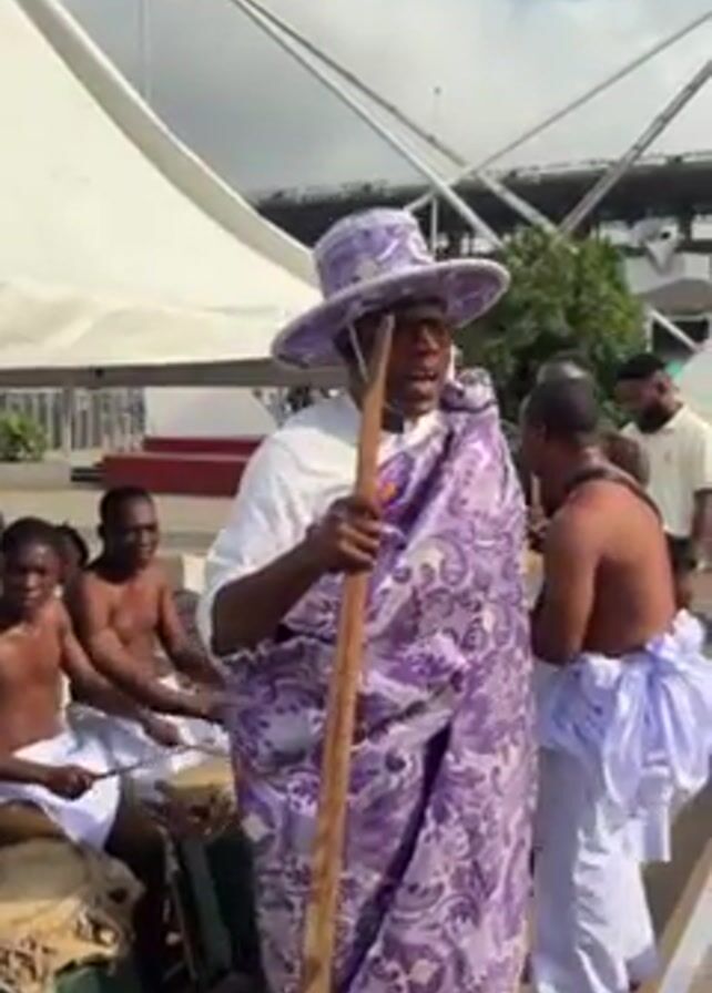 A man in traditional clothing is seen in a medium shot, standing outside. He wears a white shirt, a purple patterned shawl, and a purple hat. He holds a wooden stick in front of him. He faces the camera and appears to be speaking. There are several men behind him, some shirtless and playing drums. The man turns and places the wooden stick on the back of one of the shirtless men. In the background is a white tent structure and stadium seating. It is a sunny day.