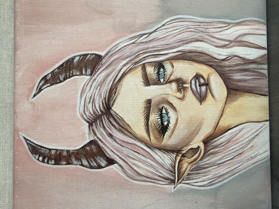 A photograph depicts a rectangular artwork, specifically a painting or drawing, mounted against a light-colored surface. The artwork portrays a stylized bust portrait of a humanoid female figure. The figure features pale skin, large light blue eyes accentuated with dark eyeliner and prominent lashes, thick dark eyebrows, and distinct under-eye shading. Her nose bears a small black septum ring, and her muted purple-grey lips are slightly parted, revealing a black barbell-style labret piercing on the lower lip. Pointed, elf-like ears are visible on both sides of her head. Two dark, ridged, curved horns extend upwards from the top of her head, resembling ram's horns. Long, wavy hair, primarily a light pinkish-blonde with subtle darker streaks, frames her face and flows downwards. The background of the artwork is a soft, muted pink. The top edge of the physical artwork shows evidence of fasteners, consistent with a canvas or art board. The image is reportedly located in Rostov-on-Don, Russia.