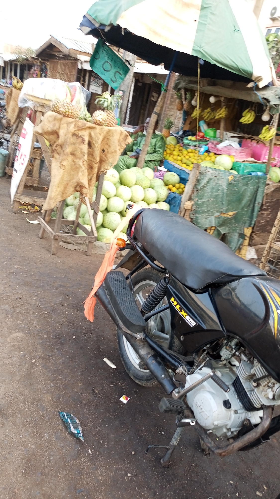 street scene in Unguwar Shanu, Nigeria. A black motorcycle with yellow accents is parked on the side of the road. Behind the motorcycle, there's a roadside fruit stand with an umbrella. The stand displays watermelons, pineapples, oranges, and bananas. A man in green clothing is sitting near the fruit stand. The road appears unpaved and slightly dirty.