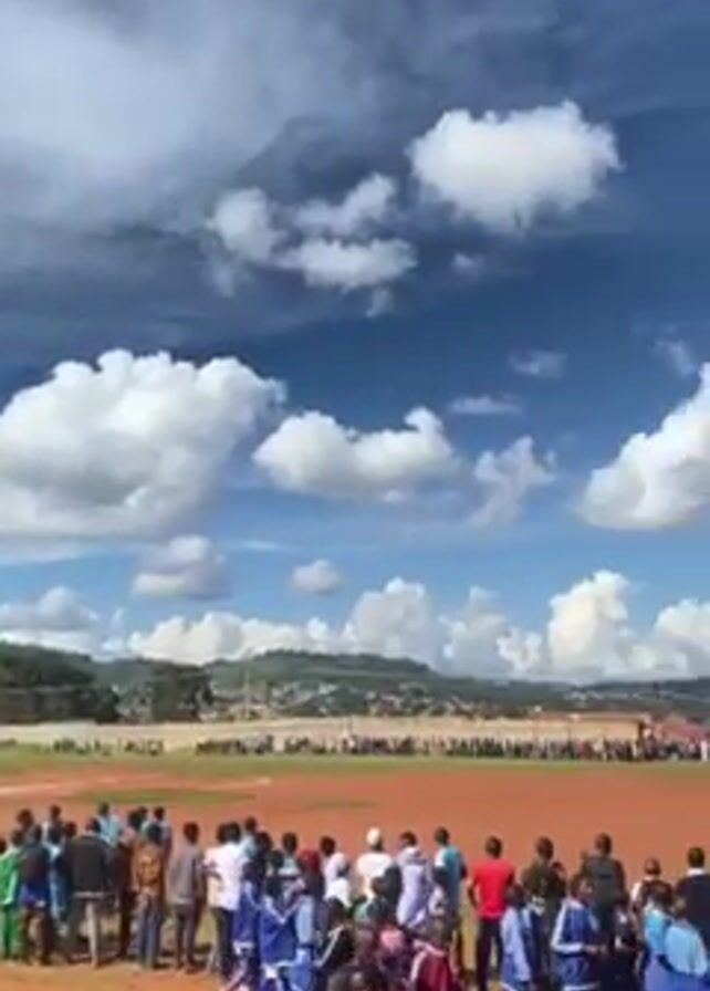 large gathering of people on a dirt field. Many of the people are wearing school uniforms. The crowd is densely packed in some areas and more spread out in others. There are trees in the background and a blue sky with white clouds above. The camera moves around, showing different sections of the crowd and the field. A city can be seen in the distance.