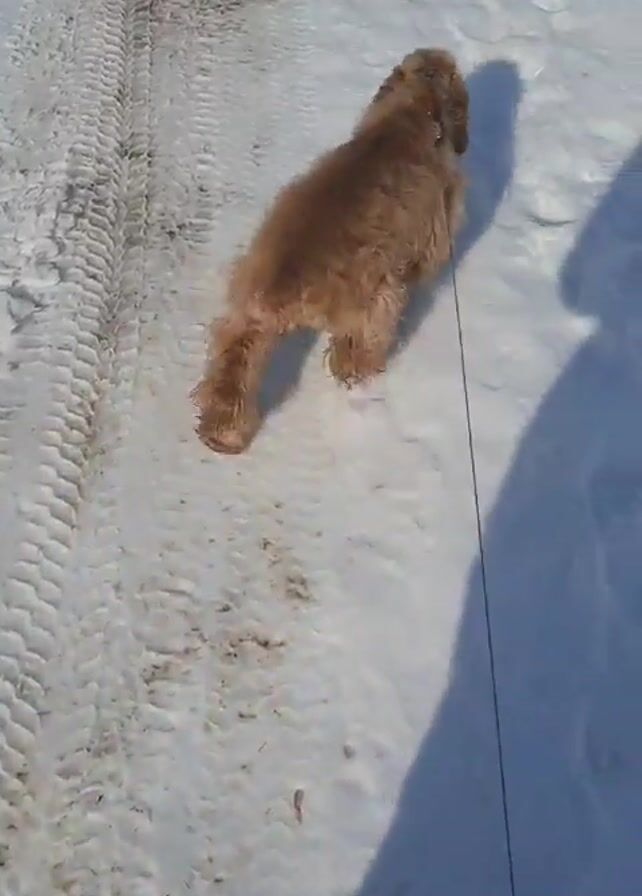 A medium-sized, golden-colored dog is walking on a snow-covered path. The dog is on a leash, and a shadow of a person holding the leash is visible. The path has tire tracks imprinted in the snow. The dog appears to be sniffing the ground. The environment is bright, suggesting a sunny day.