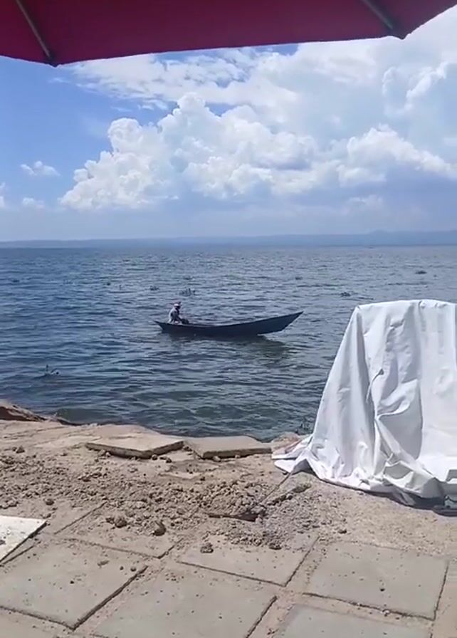 view of a lake or large body of water under a blue sky with puffy white clouds. A small boat with a person in it is on the water. The camera is positioned on a tiled patio or walkway, partially shaded by a red umbrella. Beside the patio is a small beach. Covered by a white sheet are two potted plants. To the right of the covered plants are additional potted plants and used tires along the shoreline.