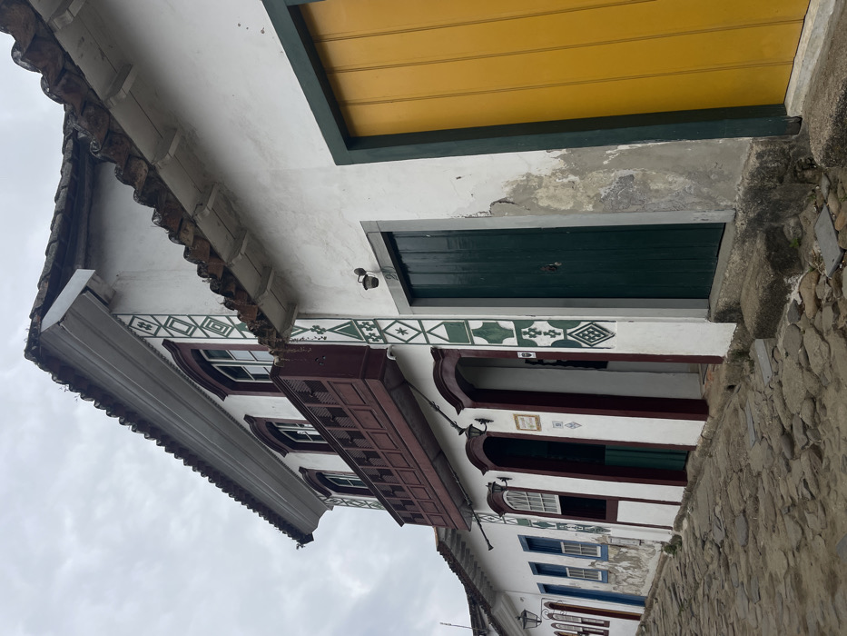 A white building with yellow and green accents features an ornate overhanging balcony. It has dark green window trim and a matching dark green door, complemented by decorative geometric patterns. A stone wall runs alongside the building. The overcast sky suggests daytime, while the angle emphasizes the height of the building, giving a unique perspective.