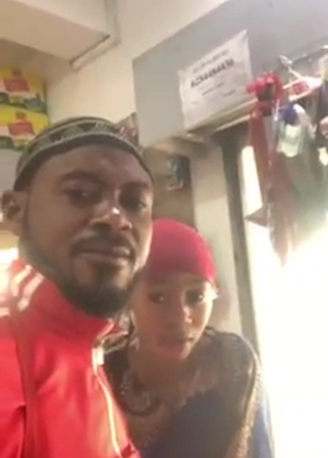 A man and a younger woman are standing close together, looking towards the camera. The man is wearing a red Adidas track jacket and a kufi hat. The woman is wearing a patterned top and a red headscarf. Behind them is a door and some shelves with various items. There is a sign with numbers on it above the door. The lighting is bright, potentially indoors. They appear to be posing for the video.