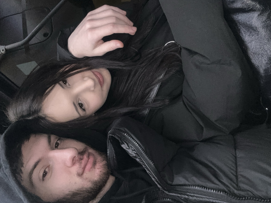 A selfie shows a young couple lying close together. The woman, with long dark hair, looks at the camera. Her hand rests near her head. The man, wearing a hooded sweatshirt, also looks at the camera with a slight beard. Both are clad in dark jackets. The lighting is muted, casting shadows across the faces and clothing. Part of a car interior is visible in the upper left corner.