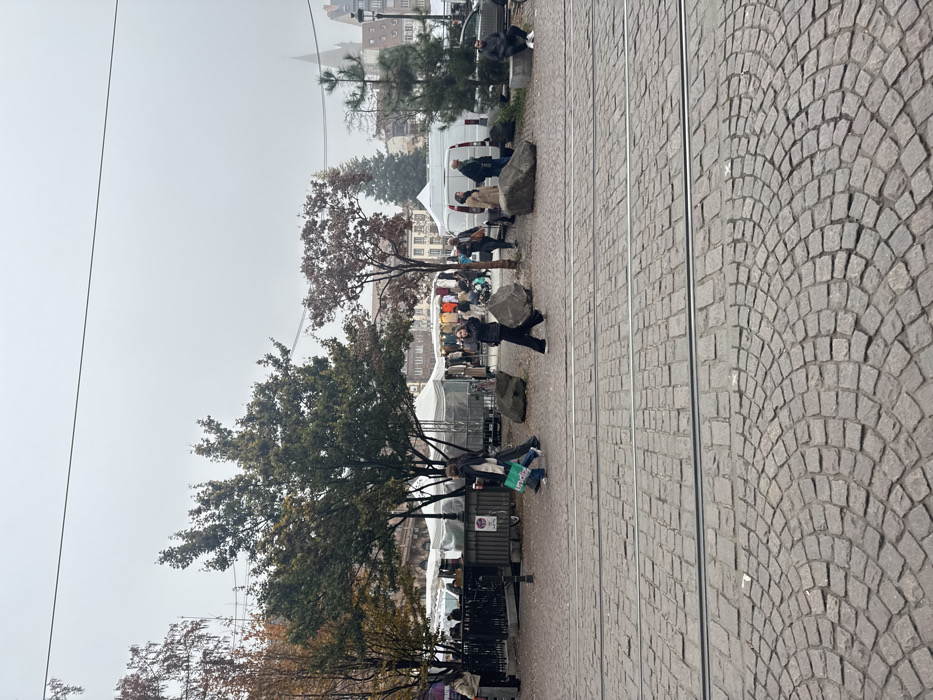 The image displays an outdoor market scene on an overcast day in Strasbourg, France. The foreground consists of a grey cobblestone square with two parallel tram tracks extending horizontally across the lower third of the frame. The cobblestones are arranged in a fanned pattern in the immediate foreground, shifting to an irregular grid further back. The midground features numerous market stalls with white canopies set up on a paved area to the right of the tram tracks. Adjacent to the stalls, several large, dark grey boulders are interspersed. A dark, low-lying structure, possibly an entrance or kiosk, is visible on the left side of the market area, fronted by a lamppost and a metal railing. Several pedestrians are present. Two individuals walk from left to right across the paved area, with one carrying a green shopping bag and a white cup. Another person walks from right to left closer to the market stalls. Multiple other individuals are standing or moving among the market tents. On the far right, a person is seated on a low stone block. White vans are parked behind some of the market stalls. The background shows multi-story buildings with traditional European architecture and various trees, some with green foliage, others displaying autumnal brown and orange hues. A tall, slender, light-colored steeple of a distant building is visible against the uniformly grey sky, positioned to the right of a prominent conifer tree.