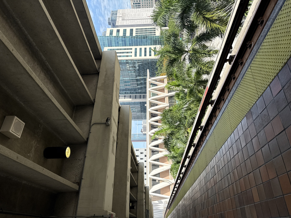 A tilted perspective showcases urban infrastructure. A gray concrete parking garage abuts a Metromover track with brown tiled walls and yellow textured safety strips. Palm trees and skyscrapers punctuate the background, seen between the structures. An enclosed walkway with distinctive white zig-zag supports is also visible. Details include lighting fixtures on the garage walls and the rail mechanisms on the track.