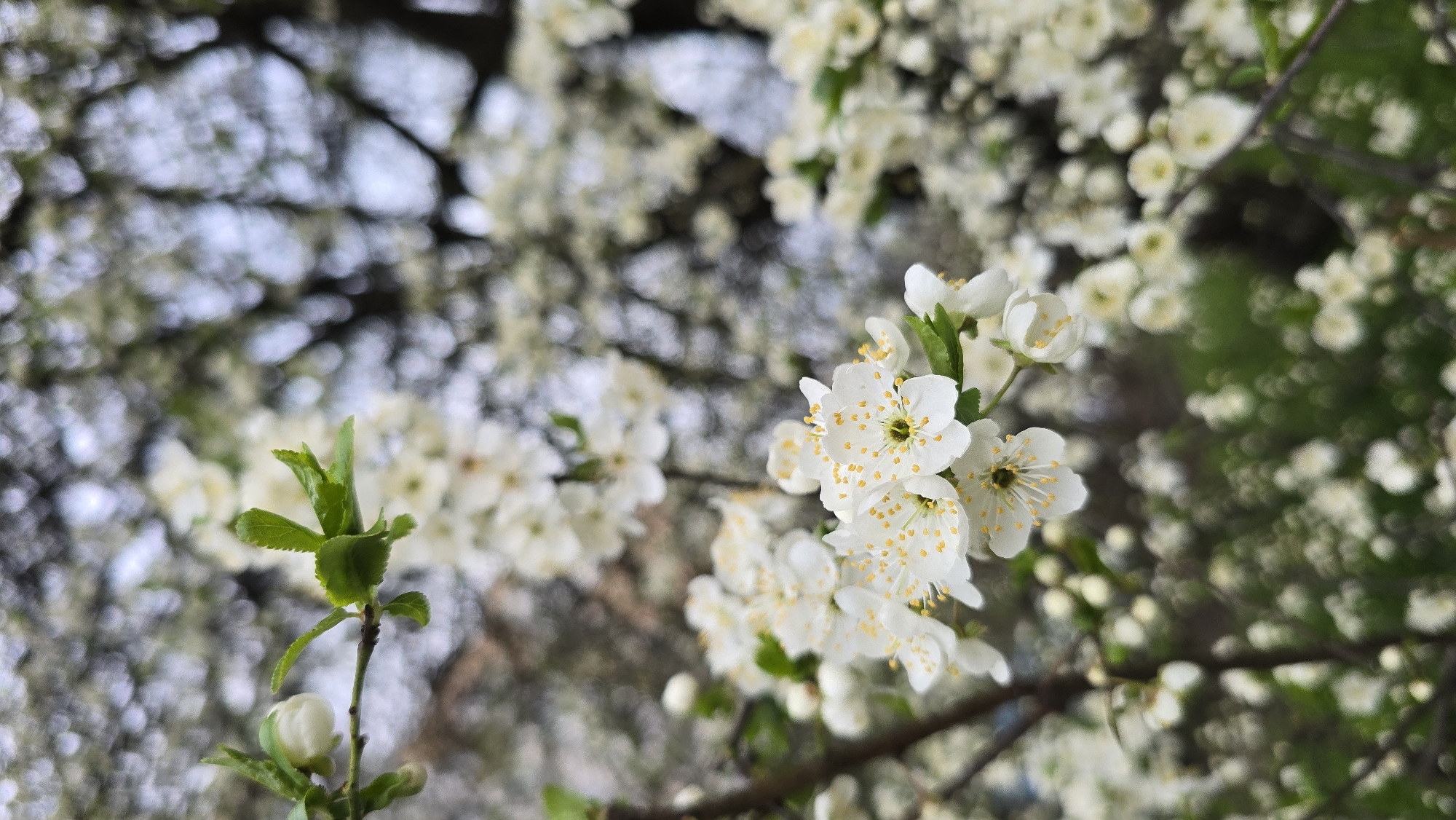 blooming white flowers, possibly cherry or plum blossoms, with yellow stamens in a tree in Pleven, Bulgaria. The background is blurred, showing more blossoms and branches against a slightly overcast sky. New green leaves are visible near the foreground.