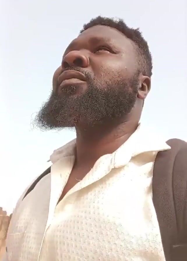 A man with dark skin, a full beard, and a light-colored patterned shirt is outside wearing a backpack. He looks upwards and then directly at the camera. The background is a bright, overcast sky, with glimpses of buildings and a water tank. Vehicle sounds are audible.