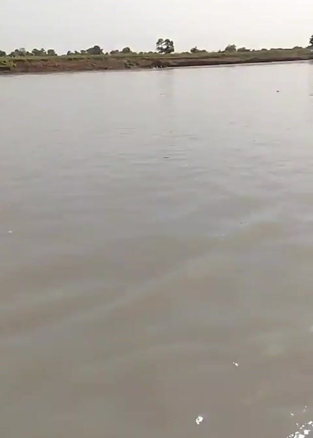 wooden boat traveling across a wide, calm body of water. The water appears slightly murky. In the distance, a flat, sandy shoreline is visible with sparse vegetation. At one point, another boat with people on board passes by. Several people are visible in the boat from which the video is recorded. The overall atmosphere suggests a rural or developing setting, and the boat ride seems to be a form of transportation. The sky is overcast. The dominant sound is the boat's engine.