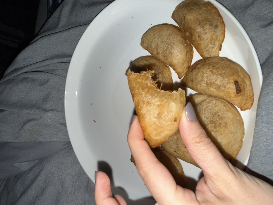 A white plate holds several fried empanadas on a gray surface. A hand is holding one empanada that has been partially eaten, revealing the filling. The empanadas are golden brown, and appear to have a crisp exterior. The hand holding the empanada has light gray nail polish. A second hand is visible in the bottom left corner of the image.