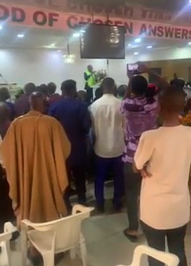 A group of people are gathered in what appears to be a church hall. A person in a bright yellow vest is standing in front of the crowd and speaking. Several people are holding up their phones, seemingly recording the event. The room is brightly lit, with rows of white plastic chairs facing the speaker. A banner hangs from the ceiling with words written on it, including "God of Chosen Answers Prayer". The people in the crowd are diverse in age and are wearing various types of clothing.