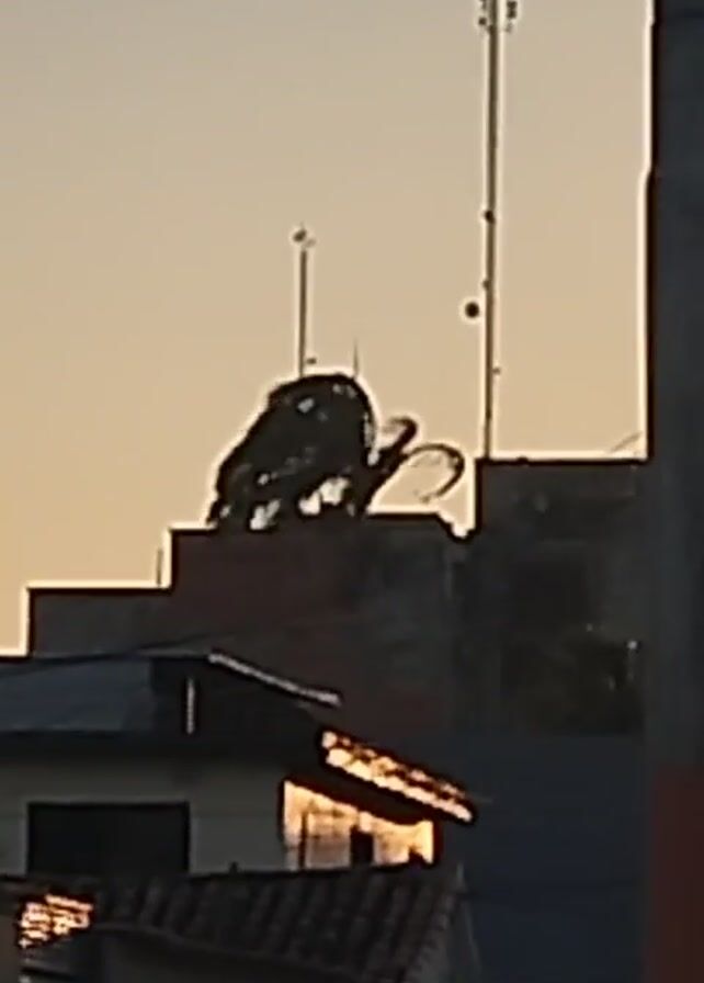 building rooftop at dusk. A dark, somewhat blurry structure stands atop the building, with what appear to be antennae or rods extending upwards from it. Other buildings are visible in the foreground, with the warm glow of the setting sun reflecting off of a window. Tall communication towers are also visible against the soft, orange-tinged sky. A vehicle sound can be heard. The video is a little shaky.