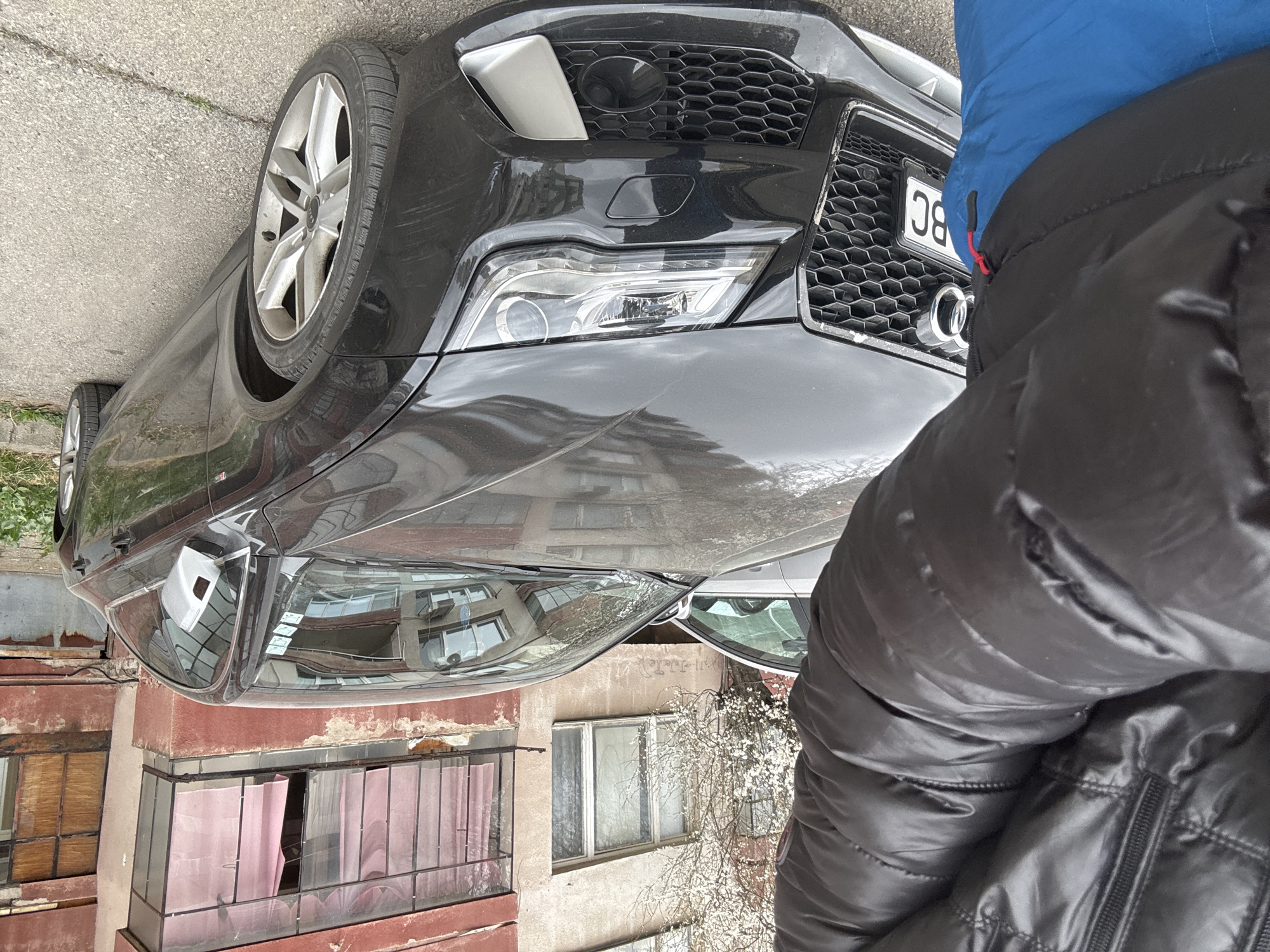 The image displays an outdoor urban scene in Kyustendil, Bulgaria. In the left foreground, the mid-section of a person is visible, clad in a shiny black puffer jacket with a red zipper pull and blue trousers. A black Audi A7 sedan is prominently parked on an asphalt surface. The vehicle features a hexagonal front grille with the Audi rings emblem, LED-style headlights, and silver-colored lower front bumper trim. The front license plate displays the regional code "BC." The passenger side mirror casing is silver, and multiple vertical stickers are present on the upper windshield. The car's front bumper and fender exhibit light scratches and dust accumulation. Behind the vehicle, two multi-story buildings are visible. The building on the left is light-colored with standard windows and faint graffiti on its lower wall. The building on the right is reddish-brown with significant paint degradation and features an enclosed balcony with pink curtains visible through glass panes. A blossoming tree with white flowers stands between the two structures. The asphalt ground beneath the car shows cracks and sparse green vegetation.