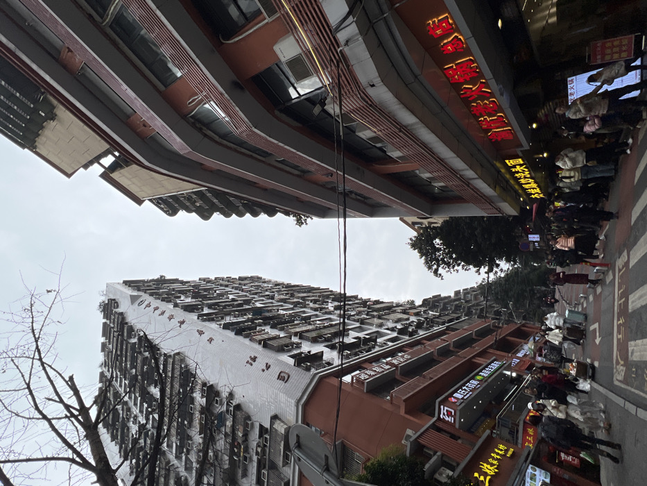 Two buildings flank a street packed with pedestrians. The building on the left has numerous air conditioning units jutting from its facade. The building on the right features red neon signage. A grey sky forms the backdrop. Wires cut through the sky between the two structures. A bare tree branch appears at the bottom left. The image is vertically flipped.