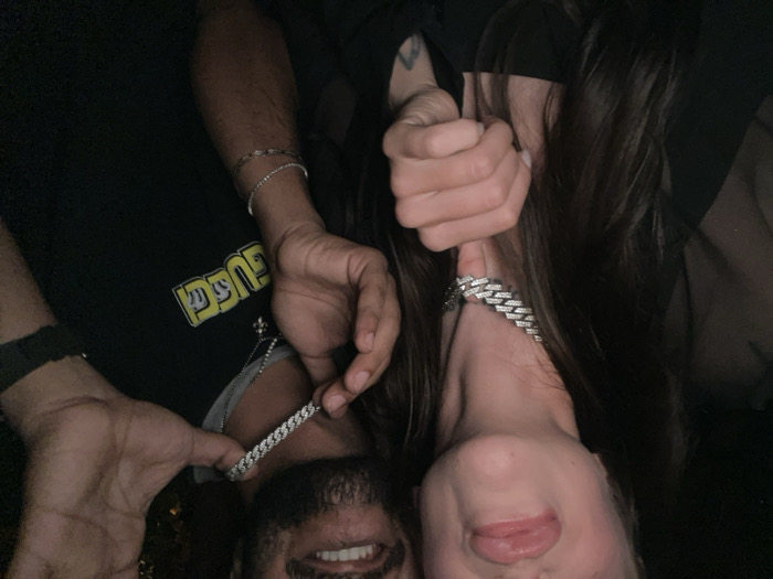 A selfie-style close-up shows two people with dark hair, one wearing a black shirt with yellow lettering, the other in black clothing. Both display icy chain necklaces and jewelry. The man's teeth are visible in a partial smile, while the woman's tongue is slightly visible. The image has a slightly dark and intimate vibe, focusing on the faces and accessories.