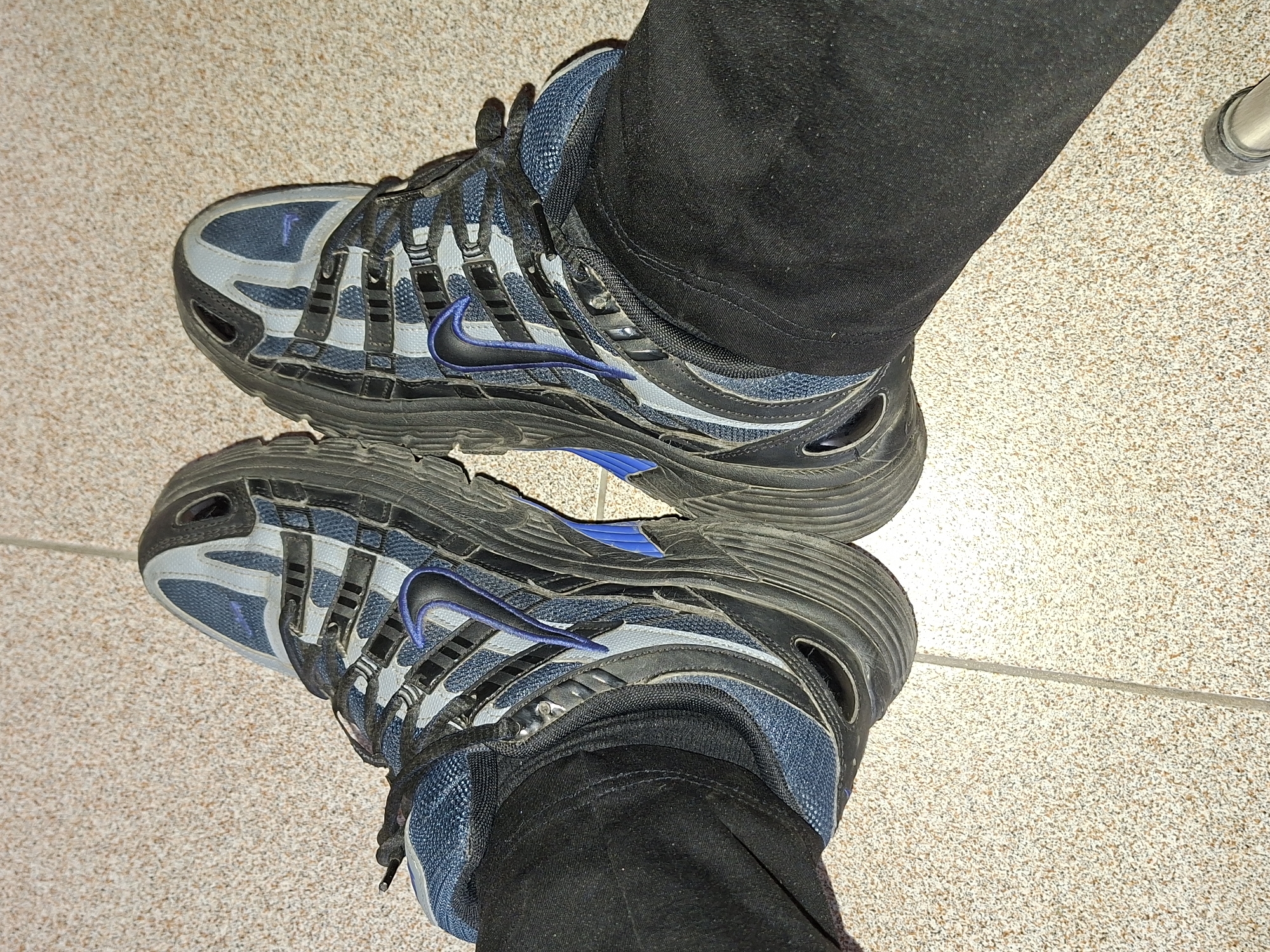 The image displays a top-down perspective of a person's lower legs and feet, taken in the city of Plovdiv, Bulgaria. The subject is wearing a pair of blue, black, and light grey Nike sneakers, which appear moderately worn with visible dust accumulation on the uppers and soles. The sneakers feature black laces, a prominent blue Nike swoosh on the lateral side, and blue accents on the midsole. The person is wearing black trousers, visible around the ankles and shins. The footwear rests on a light beige or off-white granular paved or tiled surface, characterized by small, multicolored speckles. A single dark grout or seam line bisects the ground surface horizontally in the lower portion of the frame. No other individuals or objects are discernible in the immediate vicinity.