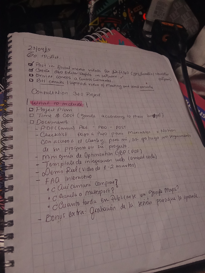 The image displays a close-up, angled view of an open, spiral-bound notebook on a grid-lined page, illuminated by a warm, dim light. The scene is located in Puente Alto, Chile. The notebook page contains handwritten text in black ink, primarily a "To Do List" and a "What to include" section for a "Consultation 360 Project," dated "23/09/25." The "To Do List" entries include: * "Post in Social media videos for Drift360 (yt+LinkedIn) Newsletter" (checked) * "Create 360 Editor Profile in Wework" (checked) * "Enviar correos a Centros Culturales" (checked) * "BH emails | Upload video of Meeting and send emails" (checked) The "What to include" section, highlighted with a pink marker, lists items for the "Consultation 360 Project": * "Project Plan" * "Time & Cost (guide according to their budget)" * "Documents." (sub-items: "PDF (Canva) PRE - PRO - POST," "Checklist: Paso a Paso para Marcables o Notion," "Con acceso a el cliente y para mí, así yo hago un seguimiento de su progreso en su proyecto.") * "Mini guía de Optimization GBP (PDF)" * "Template de integración web (embed code)" * "Demo Reel (video de 1-2 minutos)" * "FAQ Interactivo" (sub-items: "¿Qué cámara Comprar?", "¿Ricula o Matterport?", "¿Cuanto tarda en Publicarse en Google Maps?") * "Bonus extra: Grabación de la sesión para que lo guarde." The notebook has a metallic spiral binding visible on the left edge. The background features dark, indistinct fabric or objects, with a fragment of another patterned, colorful notebook visible to the left and a black electronic device with a small red indicator light visible on the right. No individuals or active interactions are present in the image.