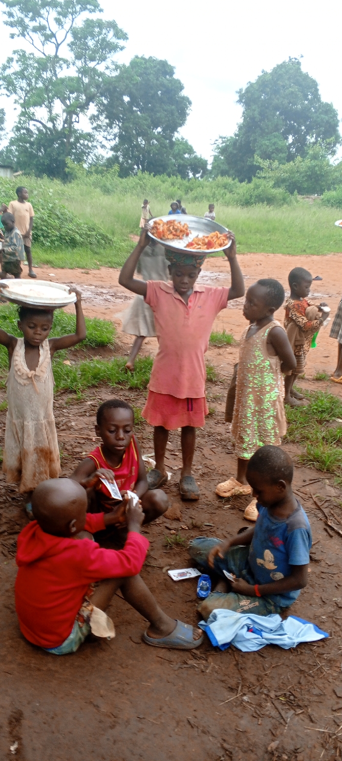 Children stand and sit in a muddy area. Some carry trays on their heads with food. Others sit on the ground playing with cards. They wear simple clothes and sandals. In the background, more children and adults stand near a grassy area with trees. The sky is overcast.