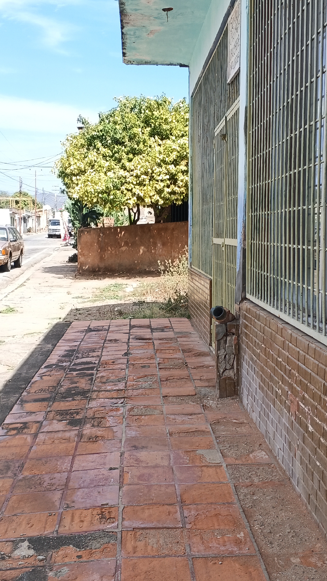 The image presents a section of a street in Juan Griego, Venezuela. A brick sidewalk runs along the right side of the frame, leading towards the street. The bricks are reddish-orange and show signs of wear and age. To the right of the sidewalk is a building with a brick wall, its upper portion covered by a metal grille. A drainage pipe protrudes from the wall. In the background, across the street, is a low, reddish-brown wall. Beyond the wall, there's a tree with yellow-green foliage. Further back along the street, one can see a few cars and buildings under a clear, blue sky. Power lines are visible overhead.