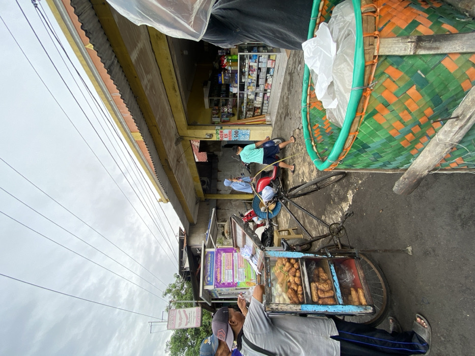 A street scene captures a food vendor with a tricycle cart displaying various fried foods. The vendor interacts with customers near a storefront. Additional individuals are seen in the background, some riding a motorcycle. A large basket rests near the cart. Overhead, power lines traverse the sky. The scene is bathed in the diffused light of an overcast day.