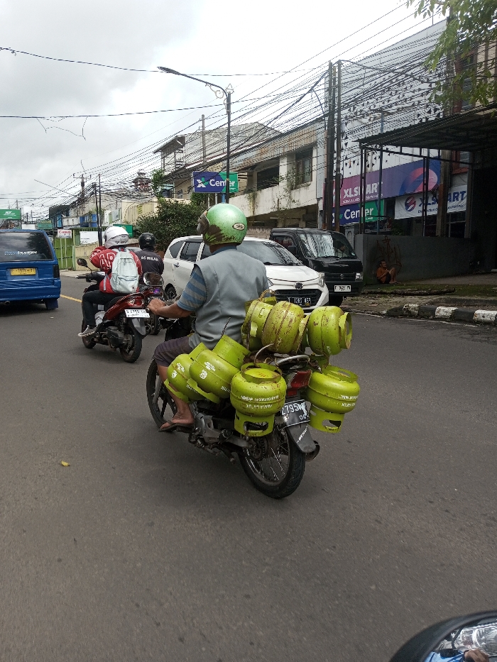 An urban street scene in Indonesia is captured under overcast skies. In the foreground, a male individual wears a light green helmet, a light grey sleeveless vest over a striped shirt, and dark shorts, riding a black motorcycle. This motorcycle is heavily laden with nine light green Pertamina 3kg LPG gas cylinders; six are secured on the rear rack, and three are visible on the left side. The motorcycle displays an Indonesian license plate, B 2795 MN. Ahead of this motorcycle, another motorcycle carries two individuals: the driver in a black helmet and jacket, and a passenger in a white helmet, red top, and a white backpack with an "AC MILAN" logo. To the left, a blue van is partially visible. On the right side of the paved road, a white car with an Indonesian license plate (B 1383 PNR) is parked or moving slowly, followed by a black micro-van (Indonesian license plate B 1381 AGD). The right side of the street is lined with commercial buildings. One building prominently displays "XL SMART" and "Center" signage, referring to XL Axiata, an Indonesian telecommunications company, and another building features a green "X Center" sign. A person wearing an orange garment is seated on the sidewalk near these buildings. Overhead utility wires are densely strung across poles along the street.