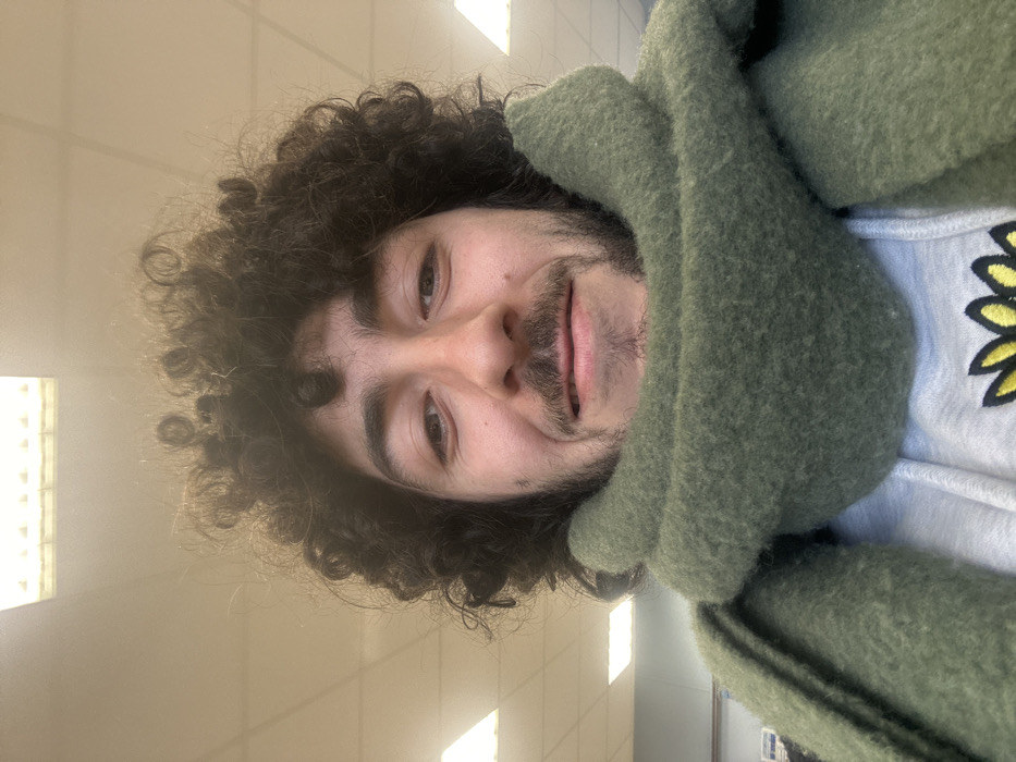 A male individual with light-to-medium skin, dark curly hair, dark eyes, and facial hair (mustache and stubble) is depicted smiling in a close-up, chest-up view
