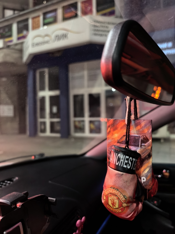 The image, captured from within a vehicle looking forward through a smudged windshield at night, displays the exterior of a commercial building in the background. Prominently in the foreground, hanging from the rearview mirror (which reflects orange light), is an air freshener or ornament composed of a rectangular piece with a fiery car graphic and two miniature red-and-white boxing gloves, each bearing the "MANCHESTER UNITED" logo and "MANCHESTER" text. A dark dashboard and a partially visible black smartphone holder are also in the foreground. The building outside is identified as an "Експрес ЛИК" (Express LIK) office, specifically located at ul. "Perushtitsa" 23, 4002 zh.k. Mladezhki halm, Plovdiv, Bulgaria. This building features a dark blue facade with prominent white-framed glass double doors and windows, a main sign displaying "Експрес ЛИК" in Cyrillic, and a row of smaller, colorful advertising panels above the main sign. No people or discernible actions are present in the scene.