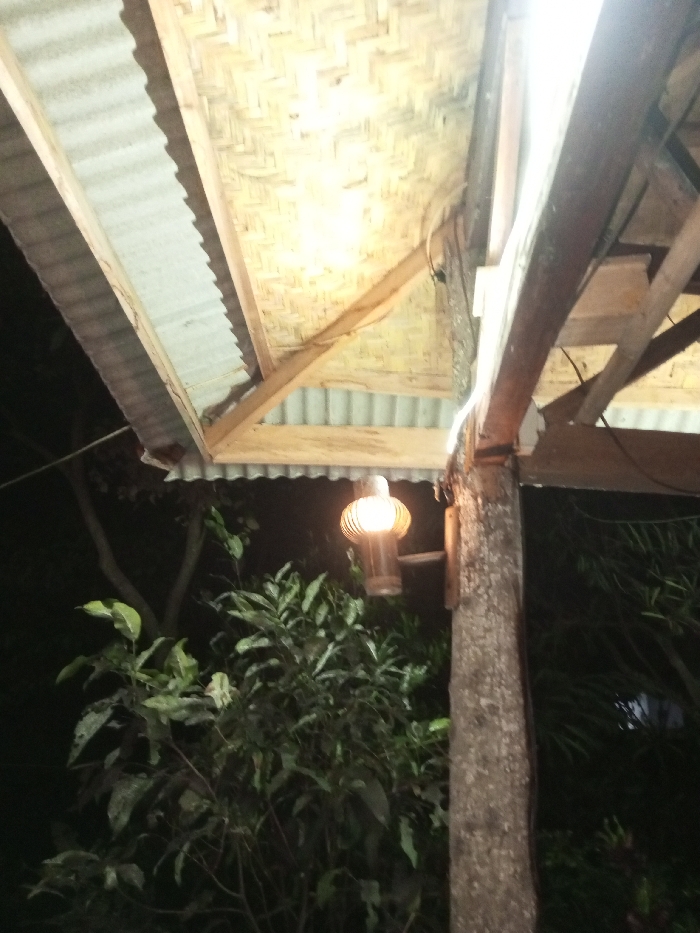 This image depicts a nighttime outdoor or semi-outdoor scene in Naya andura, India. The upper portion of the frame shows a roof structure, partially covered with corrugated metal sheeting and partially with woven bamboo or thatch panels, supported by visible wooden beams. A thick, textured tree trunk serves as a vertical support column on the right side of the frame. Attached to this tree trunk is a single, spherical lantern-style light fixture with a visible bulb inside, emitting a warm, bright glow. Electrical wiring runs along the roof structure and down the tree trunk, connecting to the light fixture. The background, below the roof and to the left of the tree, consists of dense, dark green foliage and tree branches, indicating surrounding vegetation in low light conditions. No people or specific actions are discernible.