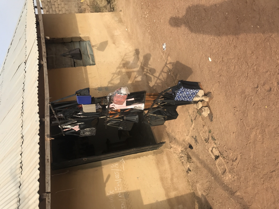 An overhead shot shows a cluttered building exterior. A corrugated metal roof partially covers a structure with a small, high window. Various bags, some black with gold chains, are displayed on a makeshift stand near the entrance. Rocks are placed near a blue and white patterned bag on the ground. The sandy, bare earth surrounding the building is marked by footprints and shadows. Writing is visible on the wall near the entrance.