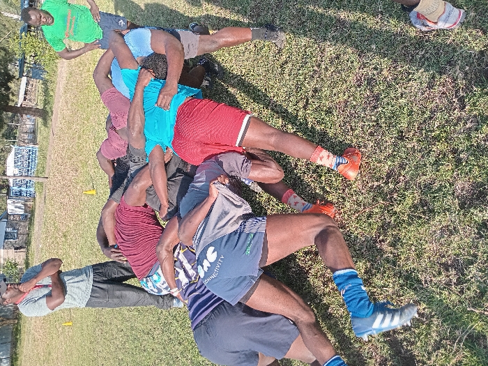 The scene depicts an outdoor rugby training session occurring on a green grass field in Nakuru, Kenya