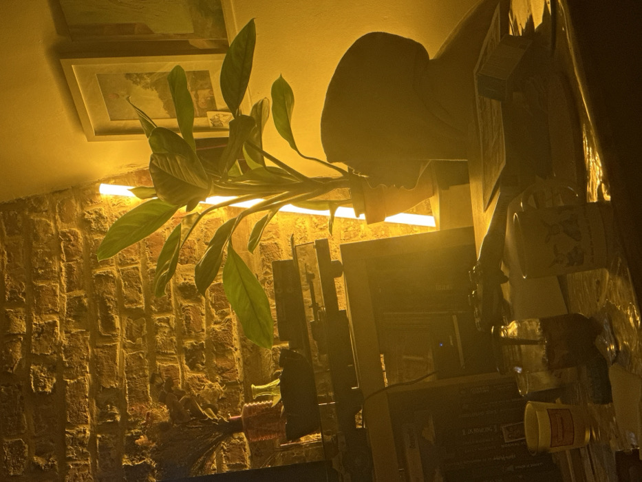 A potted plant with broad, green leaves extends horizontally from a shelf lit by a warm, linear light fixture. The plant is positioned in front of a brick wall, and above it are framed pictures. A partially obscured chair and a display shelf filled with various items are present. The overall scene is bathed in a yellow light, creating a cozy and somewhat hazy atmosphere.