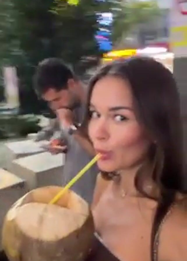 The video features a woman in the foreground drinking from a coconut with a yellow straw while holding it in her left hand