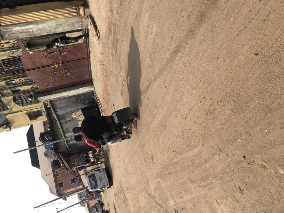 A street scene with a sandy road. A person rides a scooter with a package on the back. Buildings line one side of the road, including one with a brown gate. A vehicle is parked on the side of the road near the buildings. A shadow stretches across the road.