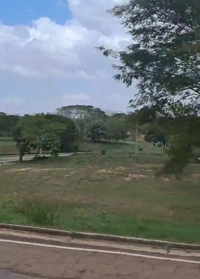 view of a roadside with trees, grass, and streetlights, captured from a moving vehicle. The sky is blue with white clouds. A guardrail is visible along the side of the road. The video appears to be taken during daylight.