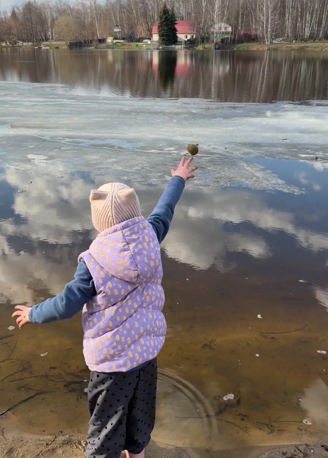 A toddler stands at the edge of a sandy beach, looking out at a lake partially covered with ice. The child, wearing a purple vest with yellow spots, a light-colored knit hat with cat ears, and dark patterned pants, throws an object into the water. The object creates ripples on the water's surface. The lake reflects the blue sky with scattered white clouds. In the background, there are trees and some houses. After throwing the object, the child squats down to touch the water.