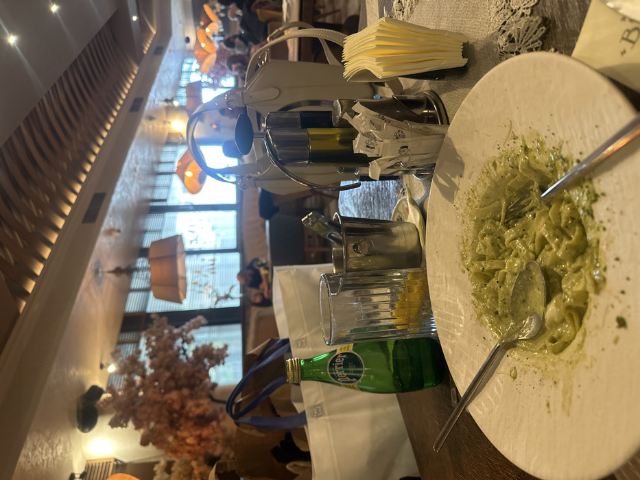 The image displays an interior dining scene within a restaurant located in Veliko Tarnovo, Bulgaria. In the immediate foreground, a white, irregularly shaped plate holds remnants of green pesto pasta (tagliatelle or fettuccine), with a silver spoon and fork resting within the remaining food. The table surface is dark wood, partially covered by a white, lace-patterned textile on the right side. On the table, from left to right, a green glass bottle of Perrier sparkling water is positioned next to a clear ribbed glass containing a lemon wedge. Behind these is a white fabric tote bag with blue handles, bearing a visible 'W' logo. A small silver ice bucket with metal tongs is situated nearby. Centrally, a chrome cruet stand holds two bottles, likely for oil and vinegar, alongside a holder containing multiple white sugar packets. To the right of the cruet set, a stack of yellow paper napkins is present, and a white handbag with light-colored straps is draped over or near the cruet stand. The background reveals the wider restaurant interior. Large windows with horizontal blinds are visible along the far wall, allowing ambient light into the space. Beyond these windows, the exterior is indistinct. Several patrons are seated at other tables, including an adult male and a smaller individual at a booth on the left side. The ceiling features decorative wooden slats and multiple warm-toned hanging light fixtures, including large drum-shaped shades and distinctive orange, organic-shaped lamps. Artificial decorative trees with pink-orange foliage are visible on the left, contributing to the restaurant's decor.