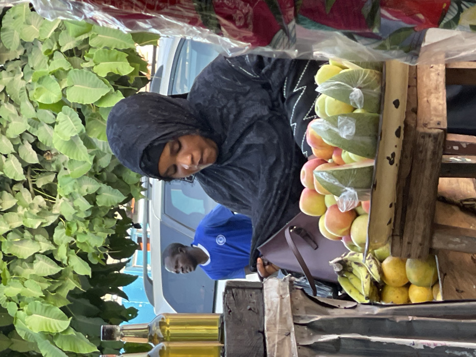 The scene depicts a street market in Samaru, Nigeria. In the foreground, a dark-skinned woman wearing a black hijab and a dark, patterned garment is positioned behind a fruit stall. Her mouth is slightly open, and her right hand holds a dark burgundy handbag. The stall features a yellow tray containing apples of various colors (red, yellow, green) and several green, wedge-shaped fruits individually wrapped in clear plastic. Below this, a bunch of yellow bananas and several oranges are visible. To the left, two clear glass bottles filled with a yellow liquid rest on a wooden surface. In the midground, a dark-skinned man in a blue t-shirt with a white circular emblem is visible, looking to his left. Behind him, parts of a light-colored vehicle are discernible. Overhead, dense green foliage is prominent. The environment suggests an outdoor, bustling market area with natural lighting.