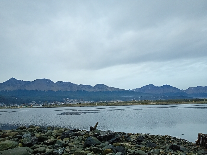 The image presents a panoramic view of Ushuaia, Argentina, under an overcast sky. The foreground consists of a rocky shoreline with numerous dark grey, brown, and green boulders and stones of varying sizes. A dark, L-shaped piece of wooden debris is partially submerged among the rocks in the lower-left quadrant. On the far right foreground, a fragmented, dark, rusted metallic or wooden structure protrudes from the rocks and water. A body of choppy, dark grey water, likely the Beagle Channel, extends across the mid-ground, reflecting the muted light from the sky. Beyond this water, a thin strip of land or a causeway is visible, running horizontally. The city of Ushuaia is situated further back, nestled along the base of a prominent mountain range. The city appears as a dense cluster of buildings with light-colored structures. The background is dominated by a rugged mountain range, stretching across the entire frame. These mountains are predominantly dark grey and exhibit patches of dark green coniferous forests at lower elevations, with some lighter-colored, possibly snow-covered or barren, areas visible towards the peaks. The sky above is completely overcast, filled with uniform light grey clouds. No people or animals are visible in the scene.