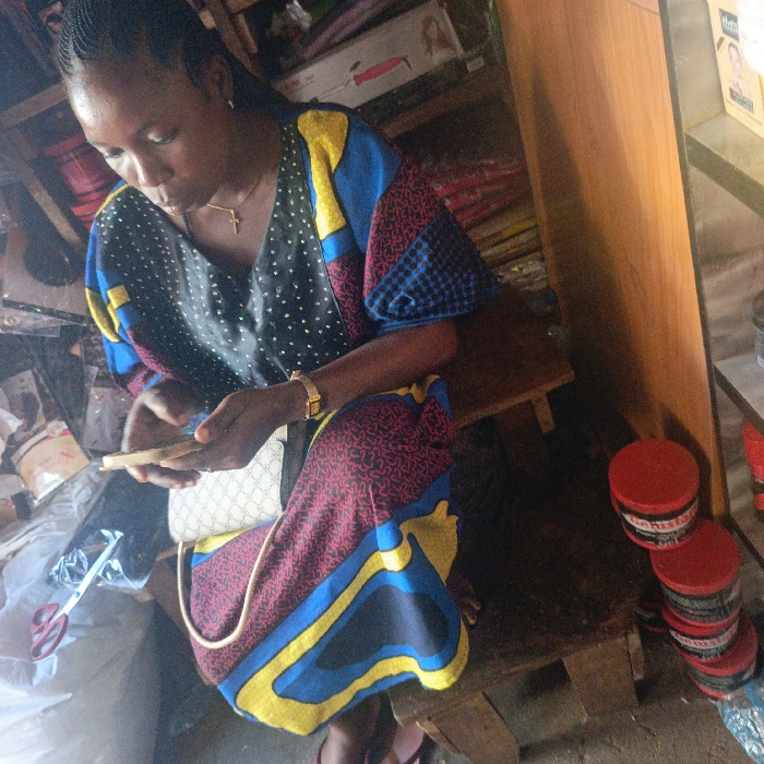 An adult female, with black braided hair, is seated on a dark wooden bench within an interior commercial space in the city of Shendam, Nigeria