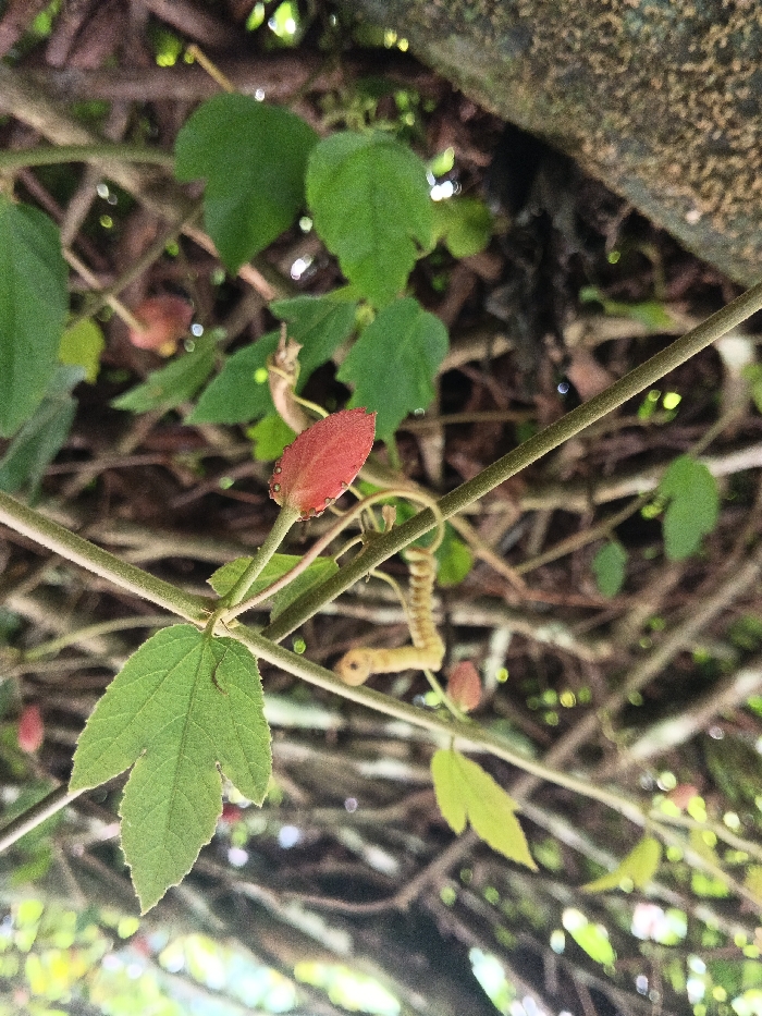 The image depicts a close-up view of botanical growth in Masulog, Philippines. No human individuals or animals are present. The primary subject is a climbing plant characterized by intertwined green stems and foliage. A prominent, elongated, reddish-orange, ovate structure, approximately 2 centimeters in length, is positioned in the upper central portion of the frame. This structure, possibly an immature fruit or flower bud, exhibits small, darker protuberances around its base. It is attached to a slender green stem. Immediately below and to the left of the central reddish structure, a distinct green leaf with three lobes is visible, measuring approximately 4 centimeters across. Other smaller, green leaves with varying shapes, some ovate, are scattered throughout the background, largely out of focus. A tightly coiled, yellowish-brown tendril is observed to the right of the central reddish object, extending downwards and to the right. Another less coiled, elongated yellowish structure, appearing to be a tendril or dried plant part, is located further to the right. The environment consists of a dense, natural setting with a heavily blurred background composed of interwoven brown branches, green leaves, and several out-of-focus, smaller reddish-orange objects similar to the central subject, indicating multiple instances on the plant. The scene is illuminated by natural light, casting varying degrees of brightness and shadow on the foliage.